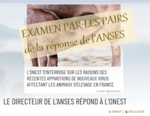 Le 25 septembre 2025, l’ONEST adressait un courrier au directeur de l’ANSES, Monsieur Benoît Vallet : https://onest-alternative.org/lonest-sinterroge-sur-les-raisons-des-recentes-apparitions-de-nouveaux-virus-affectant-les-animaux-delevage-en-france/ Ce 25 novembre 2025, Monsieur Gilles Savat, directeur par intérim, a répondu à l’ONEST. Nous publions ici la réponse ainsi que les annexes.