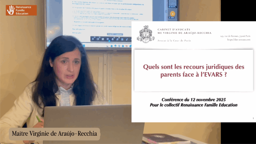 Invitée à Paris par Renaissance Famille Éducation, ce mercredi 12 novembre 2025, Me Virginie de Araújo-Recchia est avocate à la Cour de Paris spécialisée en Libertés publiques, Droits fondamentaux, Droit international, européen, Droit de la santé et Éthique.
