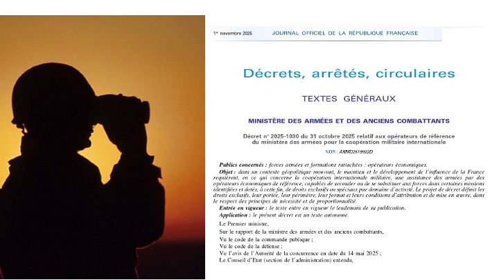 Les juristes de l’Onest ont analysé le décret n° 2025-1030 du 31 octobre 2025 relatif aux opérateurs de référence des armées pour la coopération militaire internationale, publié au Journal Officiel n° 0258 du 1er novembre 2025.